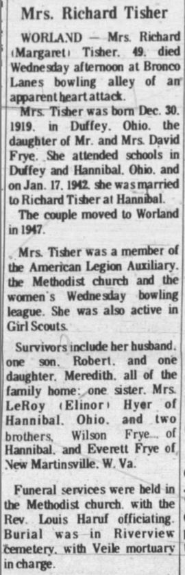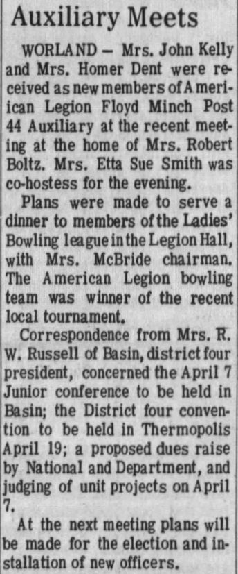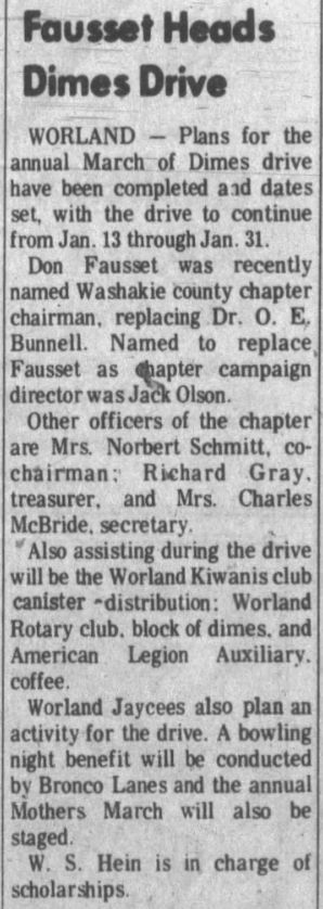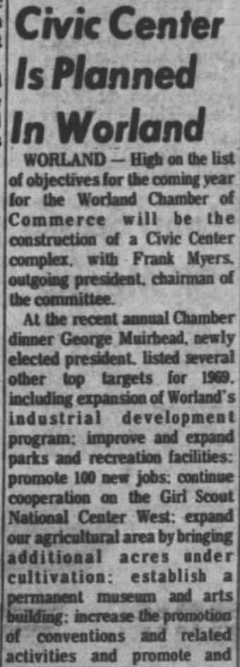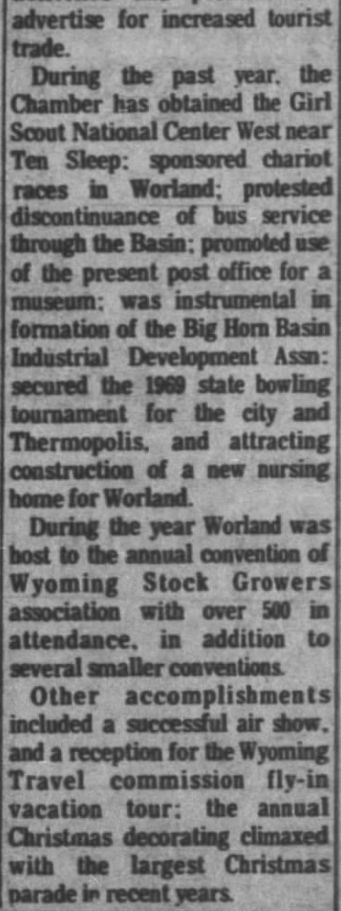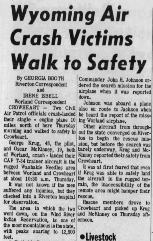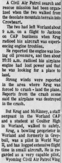 Bronco Lanes' proprietor George Krug, formerly a proprietor in Greybull, crash landed a T-34 trainer aircraft en-route from Worland to Jackson WY in January 1968 and walked safely to Crowheart WY.